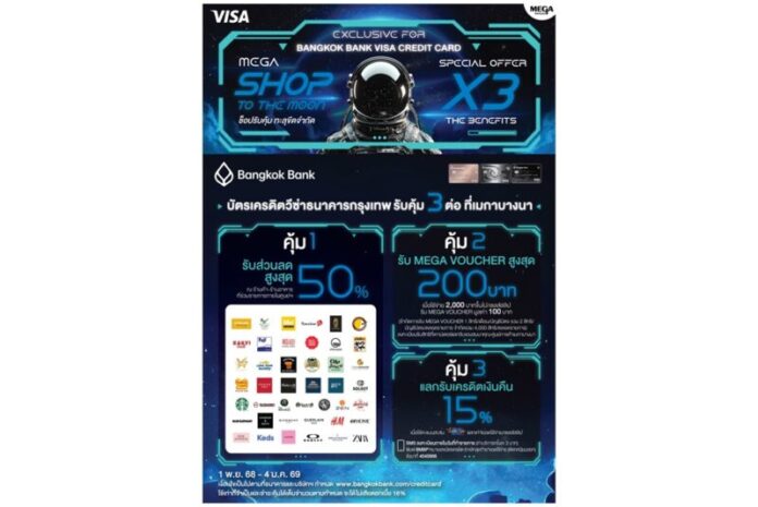 ศูนย์การค้าเมกาบางนา จับมือ บัตรเครดิตวีซ่าธนาคารกรุงเทพ มอบประสบการณ์ช็อปปิ้งสุดคุ้มส่งท้ายปี ด้วยแคมเปญพิเศษ “MEGA SHOP TO THE MOON” ช็อปรับคุ้ม ทะลุขีดจำกัด มอบสิทธิพิเศษถึง 3 ต่อสุดคุ้ม สำหรับผู้ถือบัตรเครดิตวีซ่าธนาคารกรุงเทพ เมื่อใช้จ่ายภายในศูนย์การค้าเมกาบางนา ตั้งแต่วันที่ 1 พฤศจิกายน 2568 – 4 มกราคม 2569