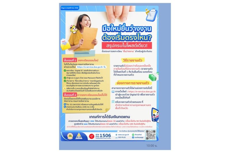 วันที่ 11 พฤศจิกายน 2568 เพจกรมการจัดหางานโพสต์ระบุว่า ว่างงานไม่ต้องกังวล ผู้ประกันตนมีสิทธิรับเงินทดแทนกรณีว่างงานได้ เพียงขึ้นทะเบียนและรายงานตัวให้ครบตามขั้นตอน