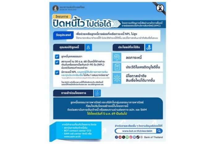 กระทรวงการคลัง ธปท. และภาคสถาบันการเงิน จึงร่วมกันดำเนินโครงการแก้ปัญหาหนี้เสียผ่านกลไกการซื้อหนี้รายย่อยของบริษัทบริหารสินทรัพย์ (Asset Management Company: AMC) ขึ้น ภายใต้ชื่อ “ปิดหนี้ไว ไปต่อได้” การช่วยเหลือในครั้งนี้เป็นมาตรการเฉพาะกิจที่จะดำเนินการเพียงครั้งเดียว โดยเน้นหนี้เสียที่ไม่มีหลักประกัน ซึ่งกลุ่มเป้าหมายคือลูกหนี้รายย่อยที่มีภาระหนี้ที่ไม่ก่อให้เกิดรายได้ (Non-Performing Loans: NPLs) ทุกประเภทสินเชื่อกับผู้ให้บริการทางการเงินทุกแห่งรวมกันไม่เกิน 100,000 บาทต่อราย ณ วันที่ 30 กันยายน 2568 ซึ่งในระยะแรกจะครอบคลุมลูกหนี้ของธนาคารพาณิชย์และบริษัทในกลุ่มธุรกิจทางการเงินของธนาคารพาณิชย์จำนวนประมาณ 1.6 ล้านบัญชี หรือ 1.2 ล้านราย ภาระหนี้ประมาณ 43,600 ล้านบาท โดยบริษัท บริหารสินทรัพย์สุขุมวิท จำกัด (SAM) จะรับซื้อหนี้ของลูกหนี้กลุ่มเป้าหมายข้างต้น เพื่อนำมาปรับโครงสร้างหนี้แบบผ่อนปรนเพื่อให้ลูกหนี้กลับมาจ่ายชำระหนี้ได้ โดย ธปท. จะปรับยุทธศาสตร์ให้ SAM เป็นบริษัทบริหารสินทรัพย์เพื่อสังคม (social AMC) ที่มุ่งเน้นช่วยแก้หนี้ให้ประชาชนโดยไม่มุ่งหากำไร ซึ่งในระยะต่อไปจะพิจารณาขยายให้ SAM รับซื้อหนี้จากผู้ให้บริการทางการเงินประเภทอื่นเพิ่มเติมด้วย