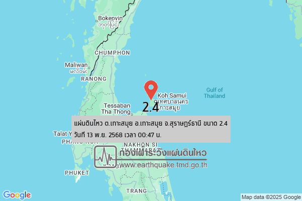 วันที่ 13 พฤศจิกายน 2568 เวลา 00.47น. กองเฝ้าระวังแผ่นดินไหว กรมอุตุนิยมวิทยา รายงานว่า เกิดแผ่นดินไหว บริเวณต.เกาะสมุย อ.เกาะสมุย จ.สุราษฎร์ธานี แผ่นดินไหวครั้งนี้ โดยมีจุดศูนย์กลางอยู่ที่ละติจูด 9.550°N, ลองจิจูด 99.956°E ขนาด 2.4 ความลึก 4 กม. มีรายงานการรับรู้ถึงแรงสั่นสะเทือนได้ในหลายพื้นที่บนเกาะสมุย