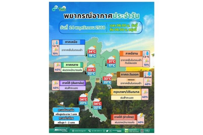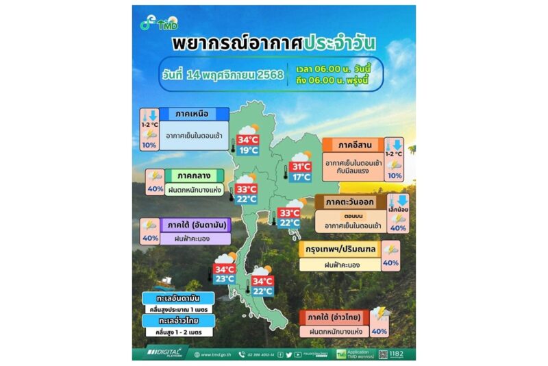 วันที่ 14 พฤศจิกายน 2568 กรมอุตุนิยมวิทยาแจ้งว่า พยากรณ์อากาศ 24 ชม.ข้างหน้า