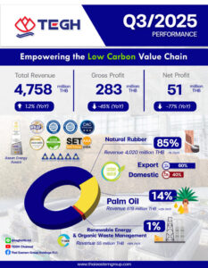 บมจ.ไทยอีสเทิร์น กรุ๊ป โฮลดิ้งส์ (TEGH) เปิดงบไตรมาส 3/68 เติบโตตามเป้า รายได้โต 1.2%YoY ผลจากการบริหารจัดการต้นทุนการผลิตที่ดี มีการกระจายตัวของลูกค้าทั้งในและต่างประเทศทั่วโลก ทำให้ยังคงรักษาการเติบโตของปริมาณการขายที่เพิ่มขึ้นได้ภายใต้สภาวะตลาดที่ท้าทาย ฟากผู้บริหาร “สินีนุช โกกนุทาภรณ์” มั่นใจรายได้รวมปีนี้แตะ 20,000 ล้านบาท สูงสุดเป็นประวัติการณ์ พร้อมส่งยานลูก “ไทยอีสเทิร์น ไบโอ พาวเวอร์ (TEBP)” เข้าตลาด mai ต้นปี 69 สะท้อนศักยภาพการเติบโตครบทุกมิติ ทั้งยางพารา ปาล์มน้ำมัน และพลังงานทดแทน