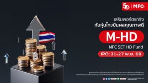 บลจ.เอ็มเอฟซี เปิดตัว “กองทุนเปิดเอ็มเอฟซี เซ็ท ไฮ ดิวิเดนด์ หุ้นทุน” (M-HD) เพิ่มทางเลือกลงทุน “หุ้นปันผลไทย” ราคายังไม่แพง อัตราผลตอบแทนเงินปันผลสูง โอกาสสร้างผลตอบแทนในระยะยาว พร้อมรับมือความไม่แน่นอนของทิศทางนโยบายเฟด ปัจจัยทางภูมิรัฐศาสตร์ มองแนวโน้มหุ้นไทยปี 69 ฟื้นตัวต่อเนื่อง เปิดขาย IPO 21-27 พ.ย 68