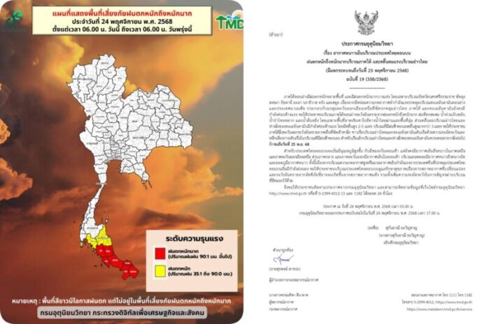 ประกาศกรมอุตุนิยมวิทยา เรื่องอากาศหนาวเย็นบริเวณประเทศไทยตอนบน ฝนตกหนักถึงหนักมากบริเวณภาคใต้ และคลื่นลมแรงบริเวณอ่าวไทย (มีผลกระทบจนถึงวันที่ 25 พฤศจิกายน 2568) ฉบับที่ 19 (358/2568)
