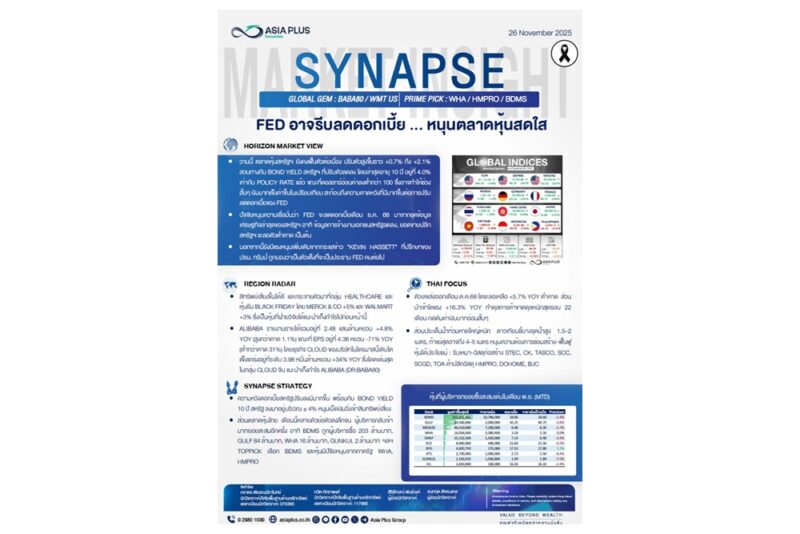 วันที่ 26 พฤศจิกายน 2568 บริษัทหลักทรัพย์ เอเซีย พลัส จำกัด (ASPS) เปิดเผยบทวิเคราะห์ระบุว่า ตลาดหุ้นสหรัฐฯ ขยับขึ้นต่อเป็นวันที่สอง เพิ่มขึ้นราว +0.7% ถึง +2.1% ท่ามกลางแรงหนุนจากความคาดหวังว่า FED อาจตัดสินใจลดดอกเบี้ยเร็วขึ้น แม้ยังเหลือประชุมเพียงครั้งเดียวในเดือนธันวาคมนี้ ขณะที่ Bond Yield 10 ปี สหรัฐฯ ลดลงแตะ 4.0% ซึ่งเท่ากับระดับดอกเบี้ยนโยบายแล้ว และดอลลาร์อ่อนค่าต่ำกว่า 100 จุด ช่วยให้เงินบาทมีแนวโน้มแข็งค่าระยะสั้น สัญญาณเศรษฐกิจล่าสุดของสหรัฐฯ ยิ่งตอกย้ำความเป็นไปได้ดังกล่าว ทั้งการจ้างงานเอกชนที่ลดลง และ ยอดขายปลีกที่ชะลอตัวต่ำกว่าคาด ขณะเดียวกัน กระแสข่าวว่า Kevin Hassett ที่ปรึกษาปธน.ทรัมป์ อาจเป็นประธาน FED คนถัดไป ก็ถูกมองว่าเอื้อต่อทิศทางดอกเบี้ยขาลงเช่นกัน