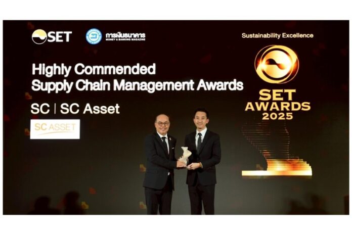 นายณัฐพงศ์ คุณากรวงศ์ ประธานเจ้าหน้าที่บริหาร บริษัท เอสซี แอสเสท คอร์ปอเรชั่น จำกัด (มหาชน) หรือ SC Asset เปิดเผยว่า บริษัทได้รับรางวัลแห่งเกียรติยศด้านความยั่งยืนจากเวที SET Awards 2025 จัดโดยตลาดหลักทรัพย์แห่งประเทศไทยและวารสารการเงินธนาคาร ได้แก่ รางวัล Sustainability Excellence: Highly Commended Supply Chain Management Awards ที่มอบให้กับบริษัทจดทะเบียน ที่มีความโดดเด่นในการบริหารจัดการห่วงโซ่อุปทานอย่างมีประสิทธิภาพ ยั่งยืนและสร้างผลลัพธ์ที่เป็นรูปธรรมต่อทั้งองค์กรและคู่ค้า เพื่อนำไปสู่โอกาสการแข่งขันเชิงธุรกิจ