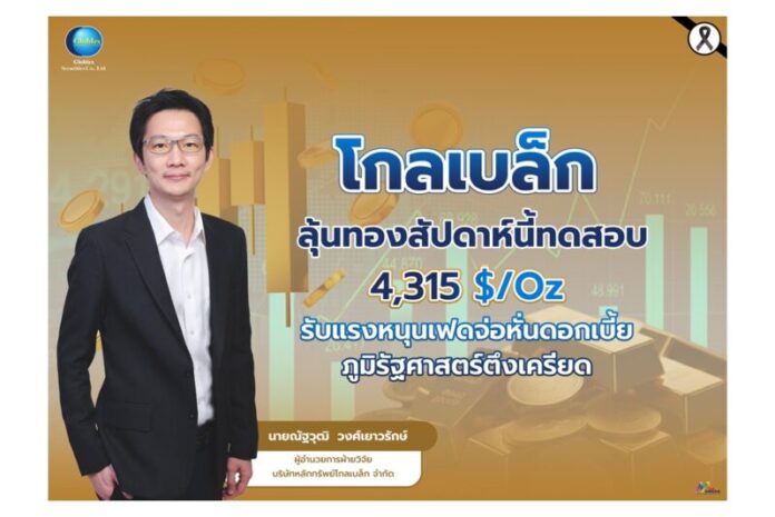 บล.โกลเบล็ก (GBS) ประเมินราคาทองคำสัปดาห์นี้ มีแนวโน้มปรับตัวขึ้น หลังเศรษฐกิจสหรัฐออกมาต่ำกว่าคาด หนุน เฟด อาจลดดอกเบี้ยเดือน ธ.ค. ด้านความตึงเครียดทางการทูตจีน–ญี่ปุ่น และสงครามรัสเซีย–ยูเครนยังสร้างความไม่แน่นอน รวมถึงข่าวว่าที่ประธานเฟดคนใหม่เคยเป็นที่ปรึกษาทรัมป์ ทำให้นักลงทุนกังวลต่อความเป็นอิสระของเฟด จึงเข้าถือทองคำเป็นสินทรัพย์ปลอดภัย กรอบราคาสัปดาห์นี้ 4,110–4,315 ดอลลาร์/ออนซ์