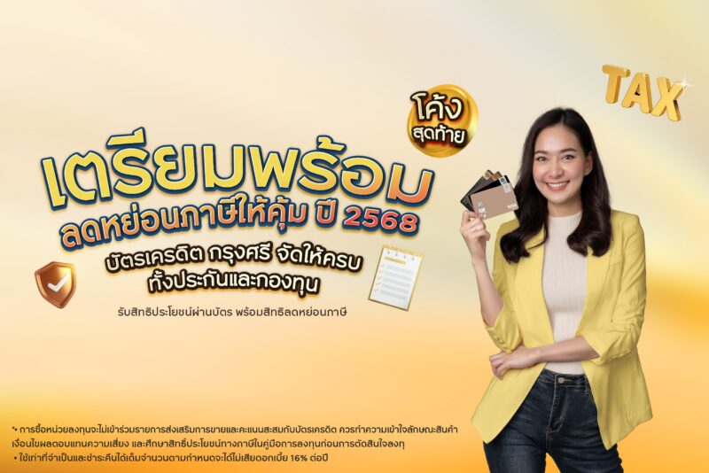 บัตรเครดิต กรุงศรี ชวนวางแผนลดหย่อนภาษีปลายปี โดยสมาชิกบัตรฯ ที่สนใจซื้อประกันและเลือกชำระค่าเบี้ยประกันสำหรับกรมธรรม์ทุกประเภททั้งปีแรกและปีต่ออายุผ่านบัตรฯ แบบรูดเต็มจำนวน รับเครดิตเงินคืนรวมสูงสุด 26,000 บาท ตามเงื่อนไขของประเภทบัตรที่ร่วมรายการ ตั้งแต่ 1 กรกฎาคม 2568 – 31 ธันวาคม 2568 พิเศษ! แลกพอยต์รับเครดิตเงินเพิ่ม 15% ตั้งแต่ 1 ธันวาคม 2568 – 31 ธันวาคม 2568 อีกทั้งประกันทุกหมวดแบ่งชำระได้ 0% นาน 3 เดือน เมื่อสะสมยอดใช้จ่ายผ่านบัตรตั้งแต่ 30,000 บาทขึ้นไป/เดือน ทำรายการได้ด้วยตัวเองผ่านแอป UCHOOSE ที่เมนู U PLAN ส่วนผู้ที่อยากเลือกซื้อกองทุนเพื่อลดหย่อนภาษีและเลือกชำระด้วยบัตรเครดิต กรุงศรี ทำได้ง่ายทางช่องทางออนไลน์ผ่าน 6 Selling Agent ครอบคลุมกองทุนจาก 8 บลจ. ชั้นนำ ตั้งแต่ 1 พฤศจิกายน 2568 – 30 ธันวาคม 2568 (เงื่อนไขและระยะเวลาของแต่ละโปรโมชันเป็นไปตามที่บริษัทฯ กำหนด) กรุณาตรวจสอบข้อมูลเพิ่มเติมจาก www.krungsricard.com (การซื้อหน่วยลงทุนจะไม่เข้าร่วมรายการส่งเสริมการขายและคะแนนสะสมกับบัตรเครดิต, ควรทำความเข้าใจลักษณะสินค้า เงื่อนไขผลตอบแทน ความเสี่ยง และศึกษาสิทธิประโยชน์ทางภาษีในคู่มือการลงทุนก่อนตัดสินใจลงทุน) ทั้งนี้ ใช้เท่าที่จำเป็นและชำระคืนได้เต็มจำนวนตามกำหนด จะได้ไม่เสียดอกเบี้ย 16% ต่อปี