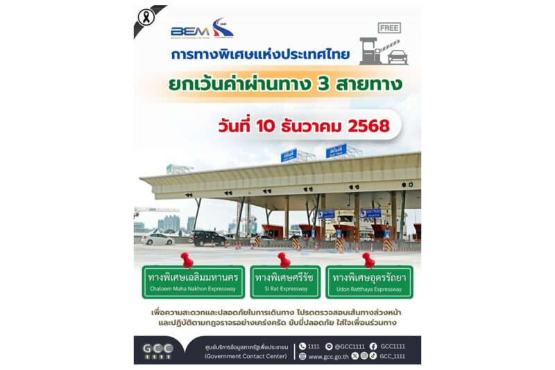 การทางพิเศษแห่งประเทศไทย (กทพ.) ประกาศยกเว้นค่าผ่านทาง 3 สายทาง เนื่องใน วันรัฐธรรมนูญ 10 ธันวาคม 2568