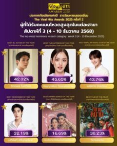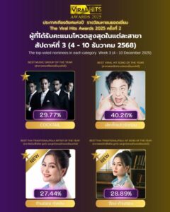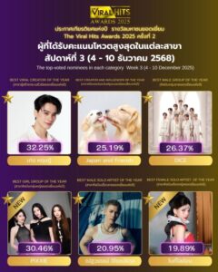 ข้อมูลคะแนนอัปเดต ณ วันที่ 10 ธันวาคม 2568 เวลา 15:00 น. ศิลปินของคุณ… กำลังรอพลังสนับสนุนจากคุณอยู่ ทุกคะแนนคือพลังที่ผลักดันศิลปินไปสู่เวทีรางวัลที่ยิ่งใหญ่ที่สุด The Viral Hits Awards 2025