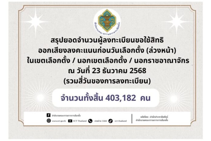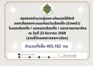 กกต.สรุปจำนวนผู้ลงทะเบียนขอใช้สิทธิเลือกตั้งล่วงหน้า และเลือกตั้งนอกราชอาณาจักร 23 ธ.ค.68(รวม 4 วันของการลงทะเบียน 403,182 คน