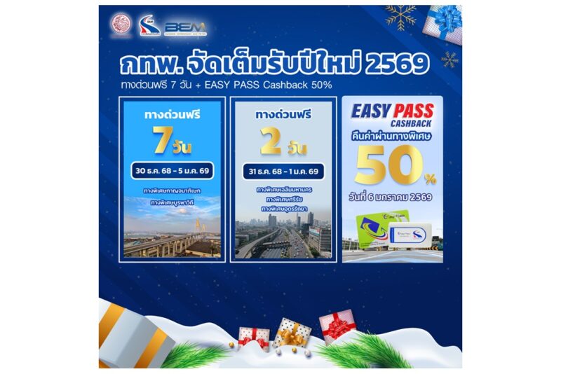 การทางพิเศษแห่งประเทศไทย เปิดโครงการอำนวยความสะดวกและความปลอดภัยรองรับการเดินทางของประชาชน พร้อมยกเว้นค่าผ่านทาง 5 สายทาง จัดแคมเปญพิเศษ “EASY PASS…Cashback” คืนค่าผ่านทาง 50% เพื่อเป็นของขวัญในช่วงเทศกาลปีใหม่ 2569