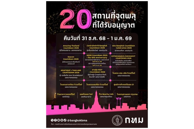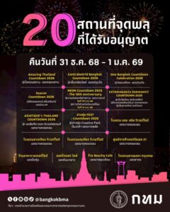 มีให้เลือกดื่มด่ำกันหลากหลายบรรยากาศ ไม่ว่าจะเป็นแลนด์มาร์กริมน้ำเจ้าพระยา ห้างใจกลางเมือง พื้นที่กิจกรรมสร้างสรรค์ หรือจะเลือกชมความสวยงามบนดาดฟ้า คืนวันที่ 31 ธ.ค. 68 – 1 ม.ค.69 นี้ ใครเล็งที่ไหนไว้ เตรียมจับจองพื้นที่กันได้เลยครับ