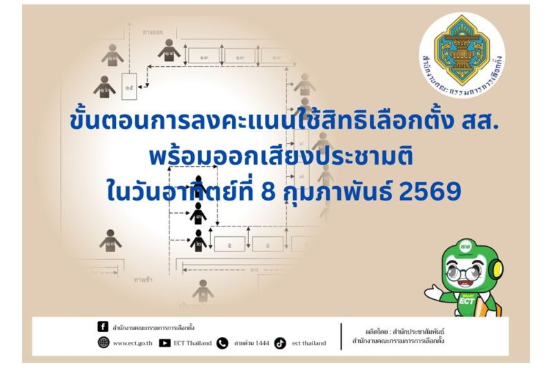 สำนักงานคณะกรรมการการเลือกตั้ง ขอประชาสัมพันธ์ขั้นตอนการลงคะแนนใช้สิทธิเลือกตั้ง สส. พร้อมออกเสียงประชามติ และแผนผังที่ออกเสียงประชามติในวันเดียวกับวันเลือกตั้ง สส. ในวันอาทิตย์ที่ 8 กุมภาพันธ์ 2569 เวลา 08.00 – 17.00 น. สามารถติดตามข้อมูลข่าวสารเกี่ยวกับการเลือกตั้งสมาชิกสภาผู้แทนราษฎรและการออกเสียงประชามติ ได้ทางเว็บไซต์สำนักงานคณะกรรมการการเลือกตั้ง www.ect.go.th หรือสำนักงานคณะกรรมการการเลือกตั้งประจำจังหวัดทุกจังหวัด หรือสอบถามรายละเอียดเพิ่มเติมได้ที่บริการสายด่วน 1444