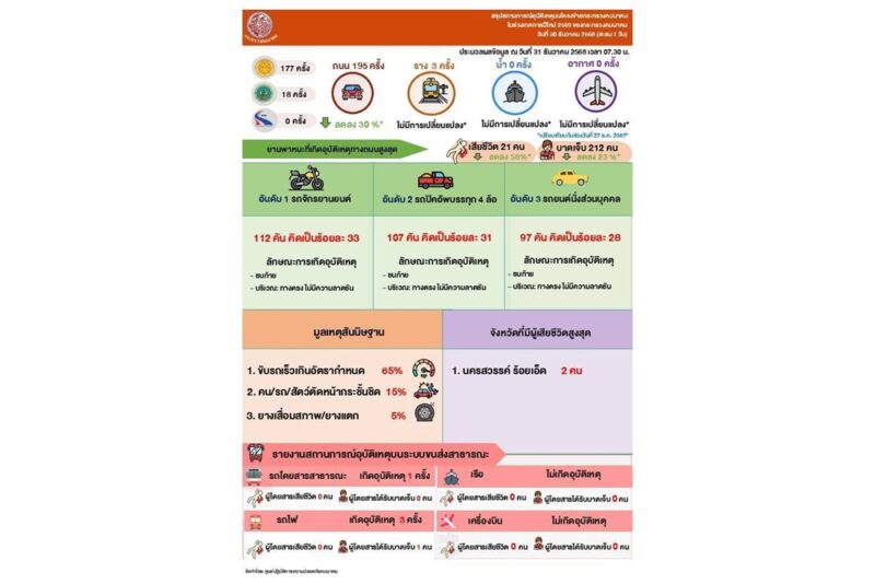 สำหรับสถิติอุบัติเหตุบนโครงข่ายของกระทรวงคมนาคม ประจำวันที่ 30 ธันวาคม 2568 (ข้อมูล ณ วันที่ 31 ธันวาคม 2568 เวลา 07.30 น.) พบว่าโครงข่ายทางบกเกิดอุบัติเหตุรวม 195 ครั้ง มีผู้บาดเจ็บ 212 คน และผู้เสียชีวิต 21 คน โดยสาเหตุหลักมาจากการขับรถเร็วเกินกำหนดจำนวน 127 ครั้ง คิดเป็นร้อยละ 65 ยานพาหนะที่เกิดเหตุสูงสุดคือรถจักรยานยนต์ 112 คัน คิดเป็นร้อยละ 33 ลักษณะพื้นที่เกิดเหตุส่วนใหญ่เป็นทางตรงไม่มีความลาดชัน จังหวัดที่มีผู้เสียชีวิตสูงสุด ได้แก่ นครสวรรค์และร้อยเอ็ด จังหวัดละ 2 ราย ขณะที่จังหวัดที่เกิดอุบัติเหตุสูงสุดคือสุพรรณบุรี 12 ครั้ง ทั้งนี้ เมื่อเปรียบเทียบกับช่วงเดียวกันของปีที่ผ่านมา (วันที่ 27 ธันวาคม 2568) พบว่าอุบัติเหตุลดลงร้อยละ 30 ผู้เสียชีวิตลดลงร้อยละ 58 และผู้บาดเจ็บลดลงร้อยละ 23 ส่วนโครงข่ายทางรางเกิดอุบัติเหตุ 3 ครั้ง มีผู้บาดเจ็บ 1 คน และไม่มีผู้เสียชีวิต ขณะที่โครงข่ายทางน้ำและทางอากาศไม่มีรายงานอุบัติเหตุ