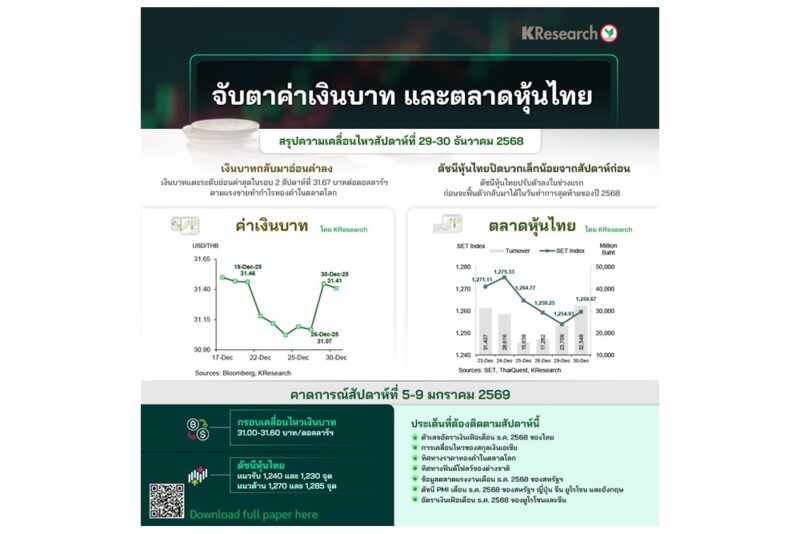 • สัปดาห์ระหว่างวันที่ 5-9 ม.ค. 2569 KBank คาดกรอบการเคลื่อนไหวของเงินบาทที่ 31.00-31.60 บาทต่อดอลลาร์ฯ ปัจจัยที่ต้องติดตาม ได้แก่ ตัวเลขอัตราเงินเฟ้อเดือนธ.ค. ของไทย ฟันด์โฟลว์ของต่างชาติ การเคลื่อนไหวของสกุลเงินเอเชียและราคาทองคำในตลาดโลก ข้อมูลตลาดแรงงานเดือนธ.ค. ของสหรัฐฯ ดัชนี PMI ภาคการผลิตและภาคบริการเดือนธ.ค. ของสหรัฐฯ ญี่ปุ่น จีน ยูโรโซน และอังกฤษ รวมถึงอัตราเงินเฟ้อเดือนธ.ค. ของยูโรโซน