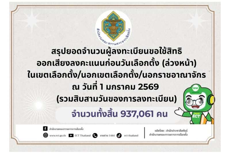 กกต.สรุปยอดจำนวนผู้ลงทะเบียนขอใช้สิทธิออกเสียงลงคะแนนก่อนวันเลือกตั้ง (ล่วงหน้า)ในเขต/เลือกตั้ง/นอกเขตเลือกตั้ง/นอกราชอาณาจักร ณ วันที่ 1 ม.ค.69 ในเขตเลือกตั้ง 4,617 คน นอกเขตเลือกตั้ง 856,813 คน นอกราชอาณาจักร 75,631 คน รวม 937,061 คน