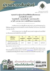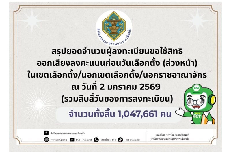 กกต.สรุปยอดจำนวนผู้ลงทะเบียนขอใช้สิทธิออกเสียงลงคะแนนก่อนวันเลือกตั้ง (ล่วงหน้า)ในเขต/เลือกตั้ง/นอกเขตเลือกตั้ง/นอกราชอาณาจักร ณ วันที่ 2 ม.ค.69 (รวม 14 วันของการลงทะเบียน) มี 1,047,661 คน โดย ผู้เขียน 3 SBN - 3 มกราคม 2026 FacebookTwitterLINE กกต.สรุปยอดจำนวนผู้ลงทะเบียนขอใช้สิทธิออกเสียงลงคะแนนก่อนวันเลือกตั้ง (ล่วงหน้า)ในเขต/เลือกตั้ง/นอกเขตเลือกตั้ง/นอกราชอาณาจักร ณ วันที่ 2 ม.ค.69 (รวม 14 วันของการลงทะเบียน) มี 1,047,661 คน Advertisement #ลงทะเบียนประชามตินอกเขต #กกต