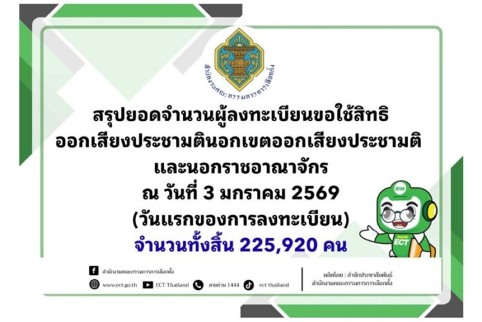 วันที่ยื่นคำขอลงทะเบียนวันที่ 3 มกราคม 2569 นอกเขตออกเสียง 207,439 คน นอกราชอาณาจักร 18,481 คน รวม 225,920 คน ข้อมูล ณ วันที่ 3 ม.ค. 2569 เวลา 17.00 น.