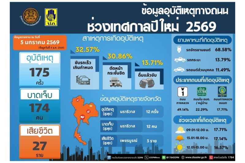 นายสหรัฐ วงศ์สกุลวิวัฒน์ รองอธิบดีกรมป้องกันและบรรเทาสาธารณภัย ในฐานะผู้ช่วยเลขานุการศูนย์อำนวยการความปลอดภัยทางถนนช่วงเทศกาลปีใหม่ 2569 และประธานแถลงข่าวสรุปผลการดำเนินงานของศูนย์อำนวยการป้องกันและลดอุบัติเหตุทางช่วงเทศกาลปีใหม่ พ.ศ. 2569 เปิดเผยว่า ศูนย์อำนวยการป้องกันและลดอุบัติเหตุทางถนนช่วงเทศกาลปีใหม่ พ.ศ. 2569 โดยกรมป้องกันและบรรเทาสาธารณภัยและความร่วมมือของภาคีเครือข่ายได้รวบรวมสถิติอุบัติเหตุทางถนน ประจำวันที่ 5 มกราคม 2569 ซึ่งเป็นวันที่หกของการรณรงค์ “ขับขี่ปลอดภัย ลดความเร็ว ลดอุบัติเหตุ” เกิดอุบัติเหตุ 175 ครั้ง ผู้บาดเจ็บ 174 คน ผู้เสียชีวิต 27 ราย สาเหตุที่ทำให้เกิดอุบัติเหตุสูงสุด ได้แก่ ขับรถเร็วเกินกำหนด ร้อยละ 32.57 ตัดหน้ากระชั้นชิด ร้อยละ 30.86 ยานพาหนะที่เกิดอุบัติเหตุสูงสุด ได้แก่ รถจักรยานยนต์ ร้อยละ 68.58 ส่วนใหญ่เกิดบนเส้นทางตรง ร้อยละ 84.57 ถนนกรมทางหลวง ร้อยละ 49.14 ถนนใน อบต./หมู่บ้าน ร้อยละ 22.29 ช่วงเวลาที่เกิดอุบัติเหตุสูงสุด ได้แก่ ช่วงเวลา 09.01 – 12.00 น. ร้อยละ 17.71 ผู้บาดเจ็บและเสียชีวิตสูงสุด อยู่ในช่วงอายุ 20 – 29 ปี ร้อยละ 18.91 โดยจังหวัดที่เกิดอุบัติเหตุสูงสุด ได้แก่ นราธิวาส (12 ครั้ง) จังหวัดที่มีผู้บาดเจ็บสูงสุด ได้แก่ นราธิวาส (12 คน) จังหวัดที่มีผู้เสียชีวิตสูงสุด ได้แก่ เพชรบูรณ์ (3 ราย) สรุปอุบัติเหตุทางถนนสะสมในช่วง 6 วัน (30 ธ.ค. 68 – 4 ม.ค. 69) เกิดอุบัติเหตุรวม 1,364 ครั้ง ผู้บาดเจ็บ รวม 1,313 คน ผู้เสียชีวิต รวม 241 ราย จังหวัดที่เกิดอุบัติเหตุสะสมสูงสุดได้แก่ ภูเก็ต (50 ครั้ง) จังหวัดที่มีผู้บาดเจ็บสะสมสูงสุด ได้แก่ ภูเก็ต (53 คน) จังหวัดที่มีผู้เสียชีวิตสะสมสูงสุด ได้แก่ กรุงเทพมหานคร (20 ราย) จังหวัดที่ไม่มีผู้เสียชีวิต (ตายเป็นศูนย์) มี 7 จังหวัด