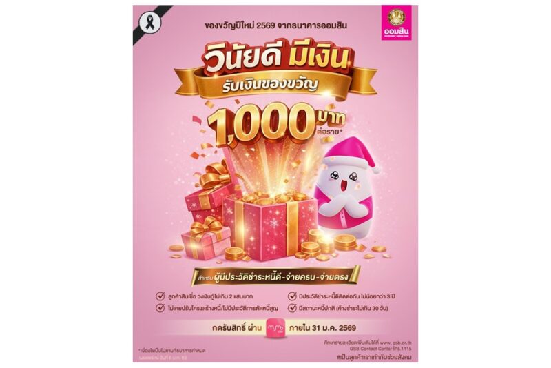 ออมสิน ไม่ทิ้งลูกหนี้มีวินัย มอบของขวัญปีใหม่รายละ 1,000 บาทแก่ผู้มีประวัติชำระหนี้ดี-จ่ายครบ-จ่ายตรง โอนเงินเข้าบัญชีภายในเดือนก.พ.69