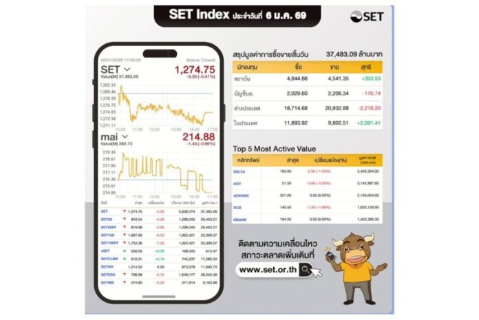 SET Index ประจำวันที่ 6 ม.ค.69 อยู่ที่ 1,274.75 -5.30 มีมูลค่าซื้อขาย 37,483.09 ล้านบาท นักลงทุนต่างประเทศขาย -2,218.20 ล้านบาท