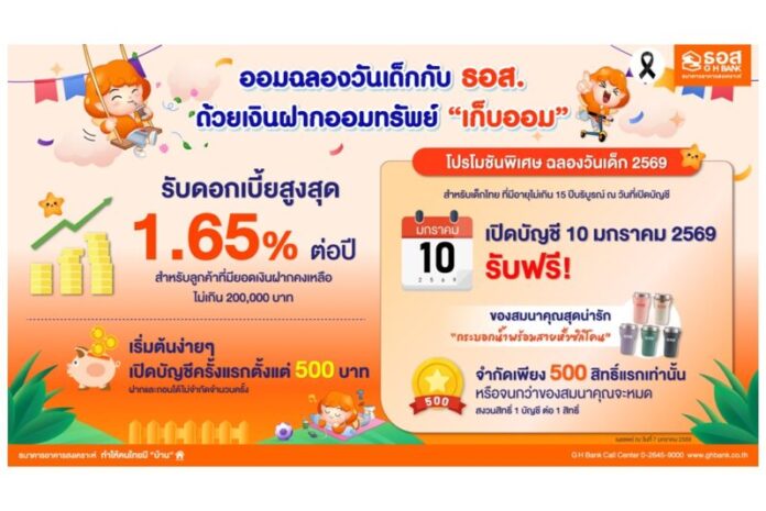 ธนาคารอาคารสงเคราะห์ (ธอส.) ร่วมส่งเสริมวินัยการออมเนื่องในเทศกาลวันเด็กแห่งชาติ ประจำปี 2569 สำหรับเด็กไทยที่มีอายุไม่เกิน 15 ปีบริบูรณ์ ออมเงินกับเงินฝากออมทรัพย์ “เก็บออม” จะได้รับผลตอบแทนจากอัตราดอกเบี้ยสูงถึง 1.65% ต่อปี (สำหรับลูกค้าที่มียอดเงินฝากคงเหลือไม่เกิน 200,000 บาท) โดยเปิดบัญชีครั้งแรกตั้งแต่ 500 บาทขึ้นไป พร้อมสิทธิพิเศษเฉพาะผู้เปิดบัญชีในวันเสาร์ที่ 10 มกราคม 2569 รับฟรีกระบอกน้ำพร้อมสายหิ้วซิลิโคนสุดน่ารักจำนวน 500 สิทธิ์ (1 บัญชี ต่อ 1 สิทธิ์) หรือจนกว่าของสมนาคุณจะหมด (เงื่อนไขเป็นไปตามที่ธนาคารกำหนด) โดยผู้ปกครองพาน้องๆ มาสร้างอนาคตทางการเงินที่มั่นคงไปกับ ธอส. ได้ง่ายๆ ซึ่งผู้ฝากสามารถฝากและถอนได้ไม่จำกัดจำนวนครั้ง และจะได้รับดอกเบี้ยเงินฝากปีละ 2 ครั้ง ในวันที่ 29 มิถุนายน และ วันที่ 29 ธันวาคม สอบถามรายละเอียดเพิ่มเติมได้ที่ G H Bank Call Center โทร 0-2645-9000 และติดตามข่าวสารของธนาคารได้ที่ G H Bank Social Media ทุกช่องทาง