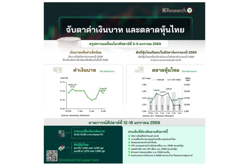 • สัปดาห์ระหว่างวันที่ 12-16 ม.ค. 2569 KBank คาดกรอบการเคลื่อนไหวของเงินบาทที่ 31.10-31.80 บาทต่อดอลลาร์ฯ ปัจจัยที่ต้องติดตาม ได้แก่ ฟันด์โฟลว์ของต่างชาติ การเคลื่อนไหวของสกุลเงินเอเชียและราคาทองคำในตลาดโลก ถ้อยแถลงของเจ้าหน้าที่เฟด ดัชนีราคาผู้บริโภคเดือนธ.ค. ดัชนีราคาผู้ผลิตและยอดค้าปลีกเดือนพ.ย. ของสหรัฐฯ รายงาน Beige Book ของเฟด ตลอดจนตัวเลขการส่งออกเดือนธ.ค. ของจีน