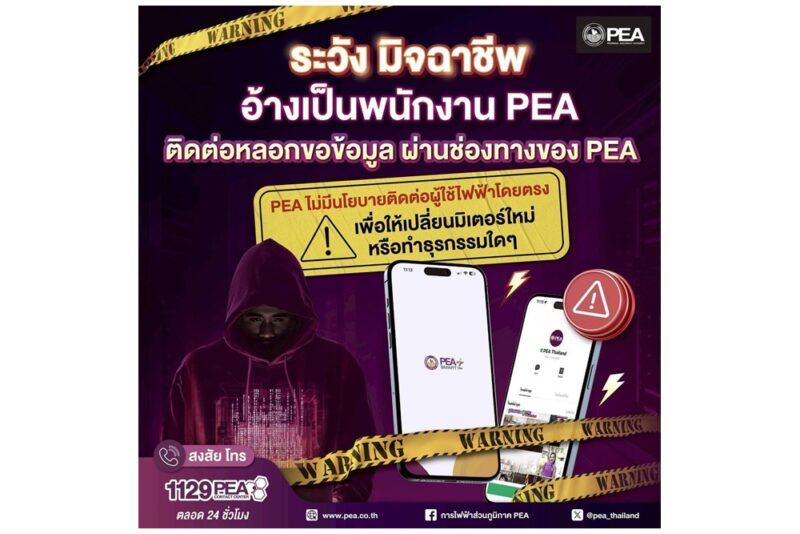 อย่าเชื่อ! PEA เตือนประชาชนระวังมิจฉาชีพแอบอ้างเป็นเจ้าหน้าที่การไฟฟ้าส่วนภูมิภาค