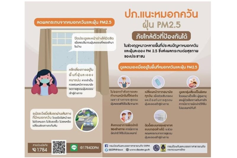กรมป้องกันและบรรเทาสาธารณภัย (ปภ.) เตือนช่วงฤดูหนาวหลายพื้นที่ประสบปัญหาหมอกควันและฝุ่นละออง PM 2.5 ที่ส่งผลกระทบต่อสุขภาพของประชาชน โดยแนะประชาชนปิดประตู – หน้าต่างให้มิดชิด หลีกเลี่ยงพื้นที่ที่มีฝุ่นหนาแน่น และเพิ่มความระมัดระวังเมื่อขับรถผ่านเส้นทางที่มีหมอกควัน