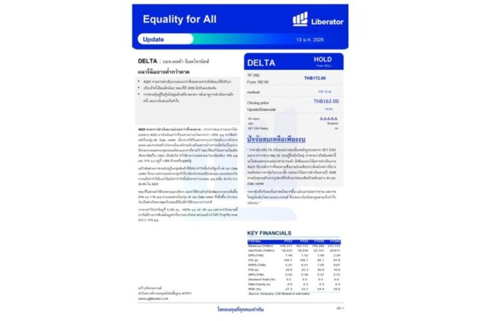 วันที่ 13 มกราคม 2569 บริษัทหลักทรัพย์ ลิเบอเรเตอร์ จำกัด หรือ “Liberator” (บล.ลิเบอเรเตอร์) เผยบทวิเคราะห์ “Equality for All”