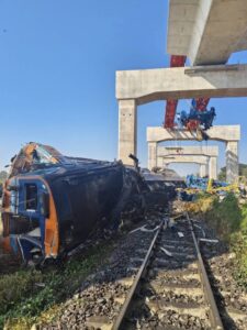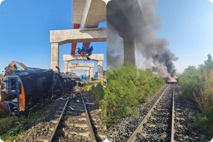 ปภ.ส่งทีมเผชิญเหตุพร้อมเครื่องจักรกลช่วยเหลือกรณีเครนก่อสร้างทางรถไฟความเร็วสูงตกทับรถไฟที่สีคิ้ว โคราช