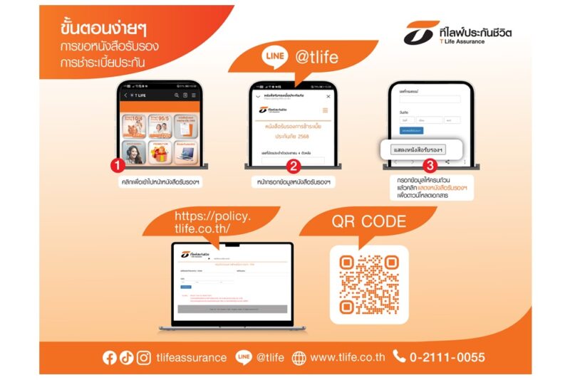 การให้บริการดังกล่าวช่วยให้ลูกค้าสามารถเข้าถึงเอกสารสำคัญได้อย่างรวดเร็ว ทุกที่ ทุกเวลา ตลอด 24 ชั่วโมง เพียงเข้า Line Official Account @tlife คลิกเมนู “หนังสือรับรองการชำระเบี้ย 2568” หรือเข้าเว็บไซต์ ที ไลฟ์ ประกันชีวิต www.tlife.co.th คลิกเมนู “หนังสือรับรองการชำระเบี้ย” หรือคลิก Link : https://policy.tlife.co.th จากนั้นทำตามขั้นตอนที่กำหนด โดยกรอกรายละเอียดให้ครบถ้วน ก็สามารถดาวน์โหลดหนังสือรับรองการชำระเบี้ยประกันภัยเพื่อนำไปใช้เป็นหลักฐานในการยื่นภาษีได้ทันที