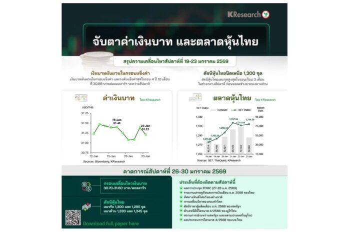 • สัปดาห์ระหว่างวันที่ 26-30 ม.ค. 2569 KBank คาดกรอบการเคลื่อนไหวของเงินบาทที่ 30.70-31.60 บาทต่อดอลลาร์ฯ ปัจจัยที่ต้องติดตาม ได้แก่ ผลการประชุม FOMC (27-28 ม.ค.) รายงานเศรษฐกิจและการเงินเดือนธ.ค. ของไทย ฟันด์โฟลว์ของต่างชาติ การเคลื่อนไหวของสกุลเงินเอเชียและราคาทองคำในตลาดโลก ดัชนีราคาผู้ผลิตเดือนธ.ค. ของสหรัฐฯ ตัวเลขจีดีพีไตรมาส 4/2568 ของยูโรโซน รวมถึงสถานการณ์ระหว่างสหรัฐฯ และหลายประเทศในยุโรป