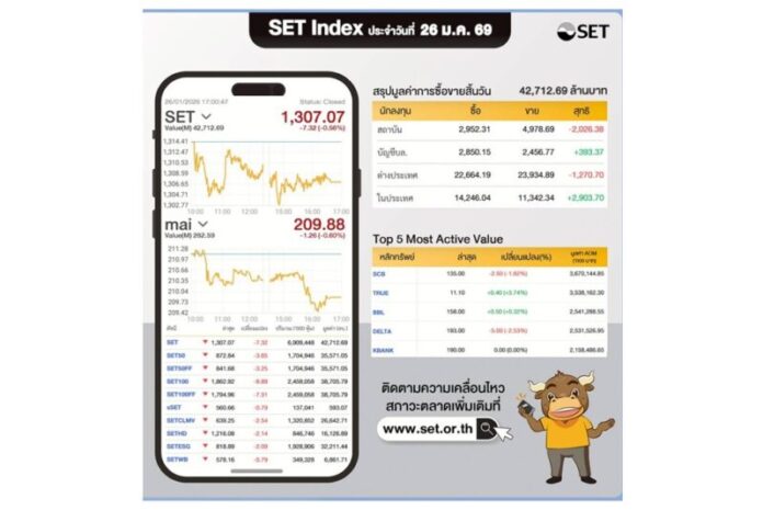 SET Index ประจำวันที่ 26 ม.ค.69 อยู่ที่ 1,307.07 จุด -7.32 จุด มีมูลค่าซื้อขาย 42,712.69 ล้านบาท นักลงทุนต่างประเทศขาย -1,270.70 ล้านบาท