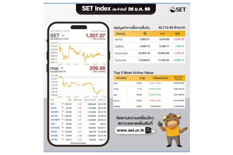 หุ้นไทย 26 ม.ค.69 ปิดลบ 7.32 จุด มาที่ 1,307.07 จุด วอลุ่ม 4.2 หมื่นล้านบาท