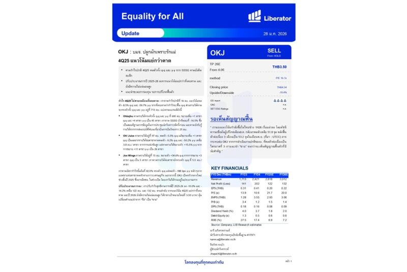 วันที่ 28 มกราคม 2569 บริษัทหลักทรัพย์ ลิเบอเรเตอร์ จำกัด หรือ “Liberator” (บล.ลิเบอเรเตอร์) ออกบทวิเคราะห์ประจำวันพุธที่ 28 มกราคม 2569