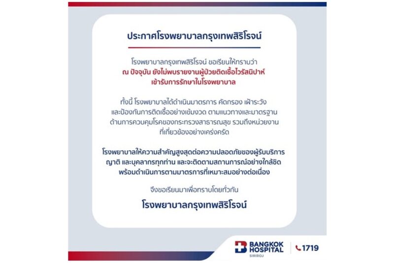 วันที่ 28 มกราคม 2569 โรงพยาบาลกรุงเทพสิริโรจน์ ออกแถลงการณ์ผ่านเพจเฟซบุ๊กอย่างเป็นทางการ เพื่อชี้แจงข้อเท็จจริง โดยระบุว่า โรงพยาบาลกรุงเทพสิริโรจน์ขอเรียนว่า ปัจจุบันยังไม่พบผู้ป่วยติดเชื้อไวรัสนิปาห์ในโรงพยาบาล