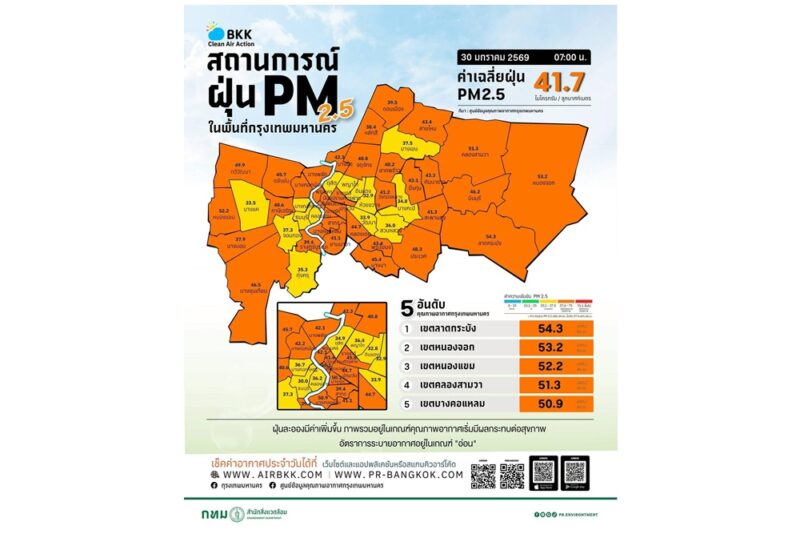วันที่ 30 มกราคม 2569 ศูนย์ข้อมูลคุณภาพอากาศกรุงเทพมหานคร ขอรายงานสถานการณ์ฝุ่นละอองขนาดไม่เกิน 2.5 ไมครอน (PM 2.5) ในกรุงเทพมหานคร