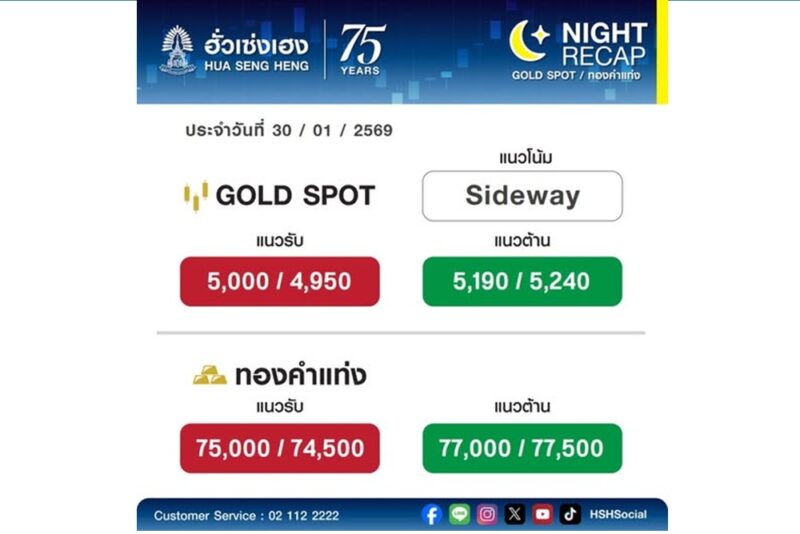 แนวโน้มราคาทองคำ (เย็น) ประจำวันที่ 30 มกราคม 2569 ทองโลกเริ่มมีการย่อตัวลง
