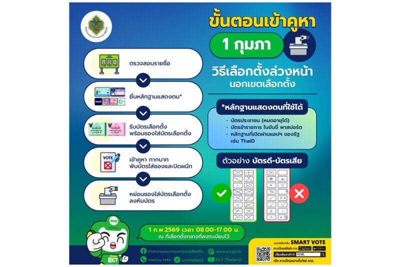 1 ก.พ.69 ผู้ที่ลงทะเบียนเลือกตั้งล่วงหน้านอกเขตเลือกตั้ง อย่าลืมออกมาใช้สิทธิ! ขั้นตอนการลงคะแนนเลือกตั้ง