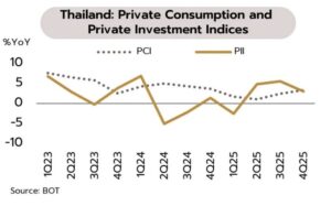 ไทย: เศรษฐกิจไทยฟื้นในไตรมาสสุดท้ายของปี 2568 แต่มีแนวโน้มชะลอลงในปีนี้ ธนาคารแห่งประเทศไทย (ธปท.) รายงานเครื่องชี้เศรษฐกิจในไตรมาส 4 ปี 2568 ภาพรวมอุปสงค์ทั้งในและต่างประเทศปรับดีขึ้นจากไตรมาสก่อน โดยการส่งออกสินค้าและรายรับภาคการท่องเที่ยวเพิ่มขึ้น ขณะเดียวกันการบริโภคภาคเอกชนได้แรงหนุนจากมาตรการกระตุ้นเศรษฐกิจ และการลงทุนภาคเอกชนขยายตัวในหมวดเครื่องจักรและอุปกรณ์