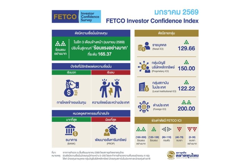 วันที่ 4 กุมภาพันธ์ 2569 นายกอบศักดิ์ ภูตระกูล ประธานกรรมการสภาธุรกิจตลาดทุนไทย เปิดเผยดัชนีความเชื่อมั่นนักลงทุน (FETCO Investor Confidence Index) ผลสำรวจในเดือนมกราคม 2569 (สำรวจระหว่างวันที่ 21-31 มกราคม 2569) พบว่า “ดัชนีความเชื่อมั่นนักลงทุน (FETCO Investor Confidence Index: ICI) ในอีก 3 เดือนข้างหน้าปรับเพิ่มขึ้นมาอยู่ในเกณฑ์ “ร้อนแรงอย่างมาก” ที่ระดับ 165.37 นักลงทุนมองว่า การไหลเข้าของเงินทุน เป็นปัจจัยหนุนความเชื่อมั่นมากที่สุด รองลงมาคือสถานการณ์การเมืองในประเทศ และนโยบายการเงินของธนาคารกลางสหรัฐฯ (FED) ปัจจัยที่ฉุดความเชื่อมั่นนักลงทุนมากที่สุด ได้แก่ สถานการณ์ความขัดแย้งระหว่างประเทศ รองลงมาคือ ความไม่แน่นอนของสถานการณ์ทางการเมืองในประเทศ และสถานการณ์เศรษฐกิจยูโรโซน