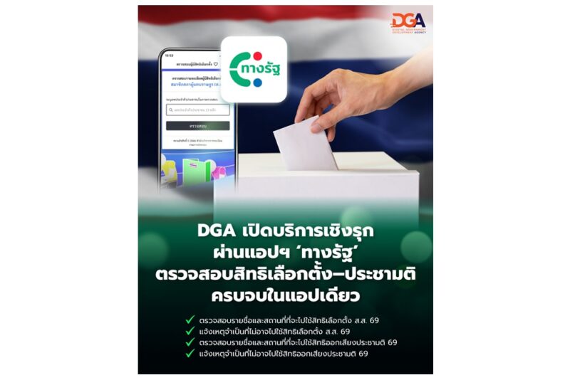 สำนักงานพัฒนารัฐบาลดิจิทัล (องค์การมหาชน) หรือ DGA เดินหน้า “รัฐบาลดิจิทัลเพื่อประชาชน” อำนวยความสะดวกให้ประชาชนตรวจสอบสิทธิเลือกตั้งสมาชิกสภาผู้แทนราษฎร และการออกเสียงประชามติ ปี 2569 ผ่านแอป “ทางรัฐ” ได้ด้วยตนเองทุกที่ทุกเวลา ลดภาระ ลดขั้นตอน และเพิ่มความมั่นใจในการใช้สิทธิ