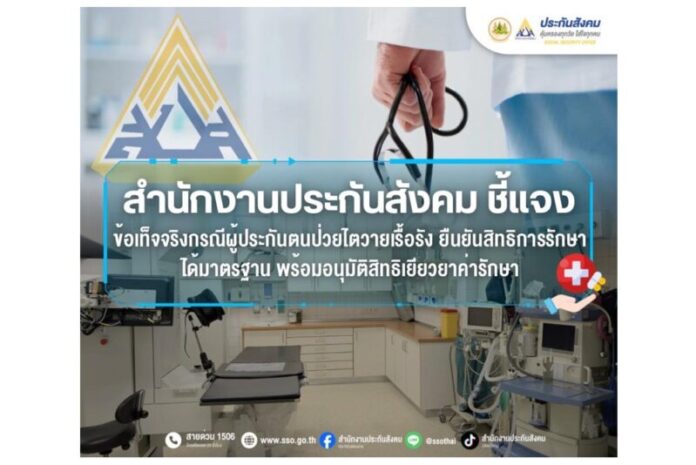 ทั้งนี้ เลขาธิการสำนักงานประกันสังคม ได้มอบหมายให้ผู้บริหารและเจ้าหน้าที่สำนักงานประกันสังคมเข้าเยี่ยมให้กำลังใจ พร้อมแนะนำขั้นตอนการเบิกจ่าย และให้คำแนะนำการดูแลสุขภาพแก่ผู้ประกันตนอีกด้วย ทั้งนี้ สำนักงานประกันสังคม ขอยืนยันว่า สิทธิการรักษาโรคไตวายเรื้อรังของผู้ประกันตนเป็นไปตามมาตรฐานสากล และไม่ด้อยกว่าสิทธิการรักษาอื่น โดยครอบคลุมค่าฟอกเลือดตามจริงไม่เกิน 1,500 บาทต่อครั้ง(สูงสุด 3 ครั้ง/สัปดาห์) พร้อมสิทธิประโยชน์เพิ่มเติมสำหรับผู้ประกันตนวัยทำงาน อาทิ เงินทดแทนการขาดรายได้ร้อยละ 50 ของค่าจ้างไปตลอดชีวิต และสิทธิการปลูกถ่ายไต (เหมาจ่ายสูงสุด 292,000 บาท) รวมถึงค่ายากดภูมิคุ้มกันระยะยาว อย่างไรก็ตาม กรณีที่ผู้ประกันตนที่ประสบปัญหาเรื่องเอกสารหรืออุปสรรคในการเข้ารับบริการ สามารถติดต่อสำนักงานประกันสังคม กรุงเทพมหานครพื้นที่/จังหวัด/สาขา ที่ท่านสะดวกทั่วประเทศโดยเร็ว เพื่อให้เจ้าหน้าที่สำนักงานประกันสังคมจะได้ให้คำแนะนำและดูแลสิทธิประโยชน์ได้อย่างทันท่วงที