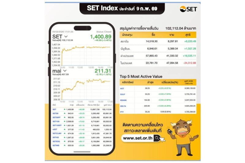SET Index ประจำวันที่ 9 ก.พ.69 อยู่ที่ 1,400.89 +46.88 มีมูลค่าซื้อขาย 102,112.04 ล้านบาท นักลงทุนต่างประเทศซื้อ +16,535.11 ล้านบาท