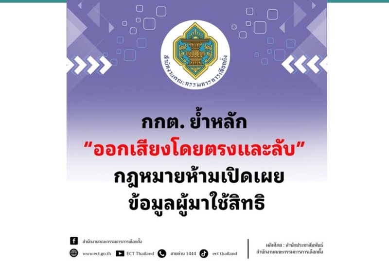สำนักงานคณะกรรมการการเลือกตั้ง ขอยืนยันว่า การเลือกตั้งดำเนินไปภายใต้หลักการ “ออกเสียงโดยตรงและลับ” ทุกขั้นตอนมีมาตรการทางกฎหมายรองรับอย่างชัดเจน เพื่อให้ผู้มีสิทธิเลือกตั้งสามารถใช้สิทธิได้อย่างมั่นใจว่า ข้อมูลและการตัดสินใจของตนได้รับความคุ้มครองตามกฎหมาย