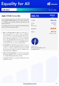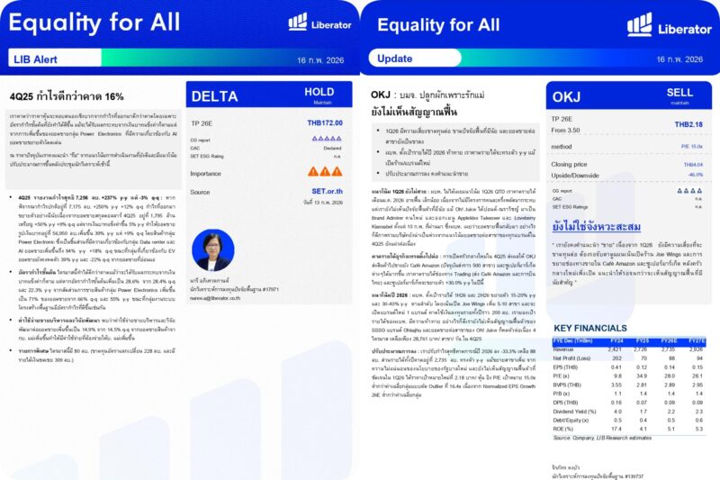 วันที่ 16 กุมภาพันธ์ 2569 บริษัทหลักทรัพย์ ลิเบอเรเตอร์ จำกัด หรือ “Liberator” (บล.ลิเบอเรเตอร์) ออกบทวิเคราะห์ประจำวันที่ 16 กุมภาพันธ์ 2569