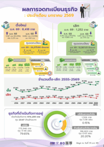 วันที่ 16 กุมภาพันธ์ 2569 นายพูนพงษ์ นัยนาภากรณ์ อธิบดีกรมพัฒนาธุรกิจการค้า กระทรวงพาณิชย์ เปิดเผย ผลการวิเคราะห์สถานการณ์การจดทะเบียนจัดตั้งธุรกิจใหม่เดือนมกราคม 2569 พบว่า มีธุรกิจจัดตั้งใหม่ 8,418 ราย เมื่อเทียบกับเดือนที่ผ่านมา (MoM) เดือนธันวาคม 2568 (5,187 ราย) เพิ่มขึ้น 3,231 ราย คิดเป็น 62.29% และเมื่อเทียบกับช่วงเวลาเดียวกันของปีที่ผ่านมา (YoY) เดือนมกราคม 2568 (8,862 ราย) ลดลง 444 ราย คิดเป็น 5.01%