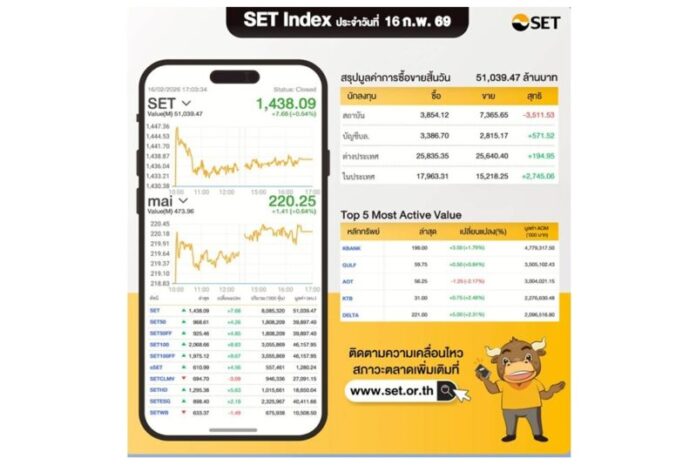 SET Index ประจำวันที่ 16 ก.พ.69 อยู่ที่ 1,438.09 จุด +7.68 จุด มีมูลค่าซื้อขาย 51,039.47 ล้านบาท นักลงทุนต่างประเทศซื้อ +194.95 ล้านบาท